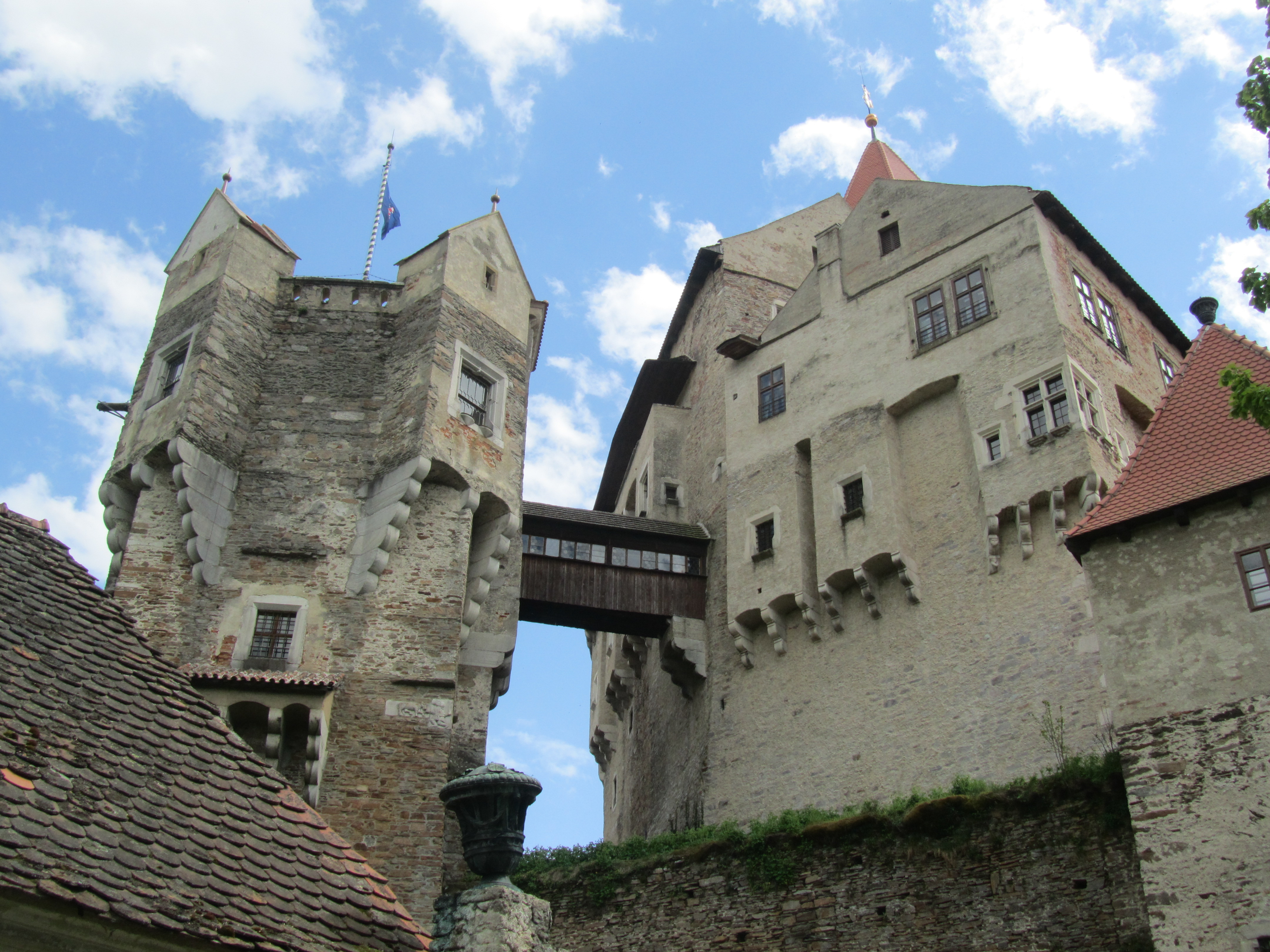 The construction of the ‘chemise’, or building the walls and buildings in the core from the outer side started in the first quarter of the 15th century under Vilém (I) of Pernštejn. The inner battlements in the northwest corner, through which led the only entrance to the inner castle, were strengthened by the rectangular ‘Four Seasons Tower’ with a dungeon and armoury, and the northeast corner layout secured by a round ‘clock tower’ with a sharp edge. The inner castle and new northwest foreground – central (second) bailey – was surrounded by a walled moat. The third gate and a strong barbican secured the entrance to this bailey. An inner (first) bailey then appeared on the saddle of land in the foreground of the castle. Pernštejn was a foothold of the Hussites during the Hussite wars and the reign of George of Poděbrady. Before 1460 it was damaged by a big fire, then extensive Late Gothic building activity took place under Jan (I) of Pernštejn (in certain places also beforehand). The fourth gate was
